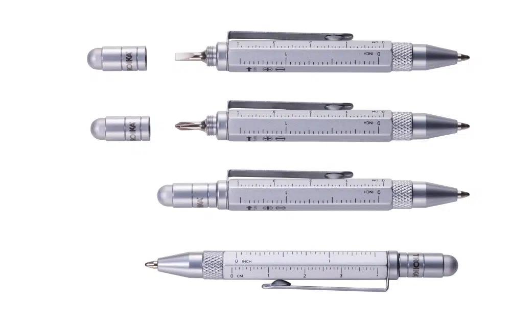 Troika'nın "Liliput" Construction çok görevli mini tükenmez kalemi, yazma rahatlığı ve cerrahi tutuş için altı kenarlı bir gövdeye sahiptir. Kolay bir döndürme hareketi iki mini aleti ortaya çıkarır: gözlükler ve küçük elektronik cihazlar için mükemmel olan oluklu ve Philips kafalı bir tornavida. Liliput'un ucunda dokunmatik ekranlar için yerleşik bir kalem bulunur; kalemin yan tarafında 2 inç ve 5 santimetrelik bir cetvel bulunur. Kullanışlı bir cep klipsine sahip kaliteli tam metal yapı, Troika'nın çok amaçlı Liliput kalemi, taşınabilirliğin işlevsellikle buluşmasını sağlar.