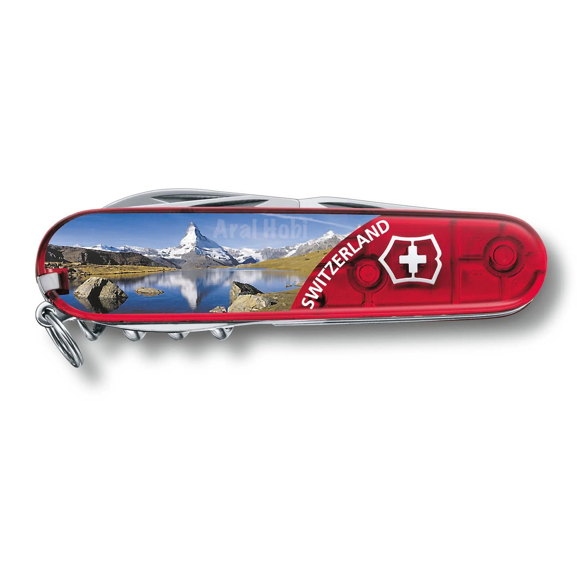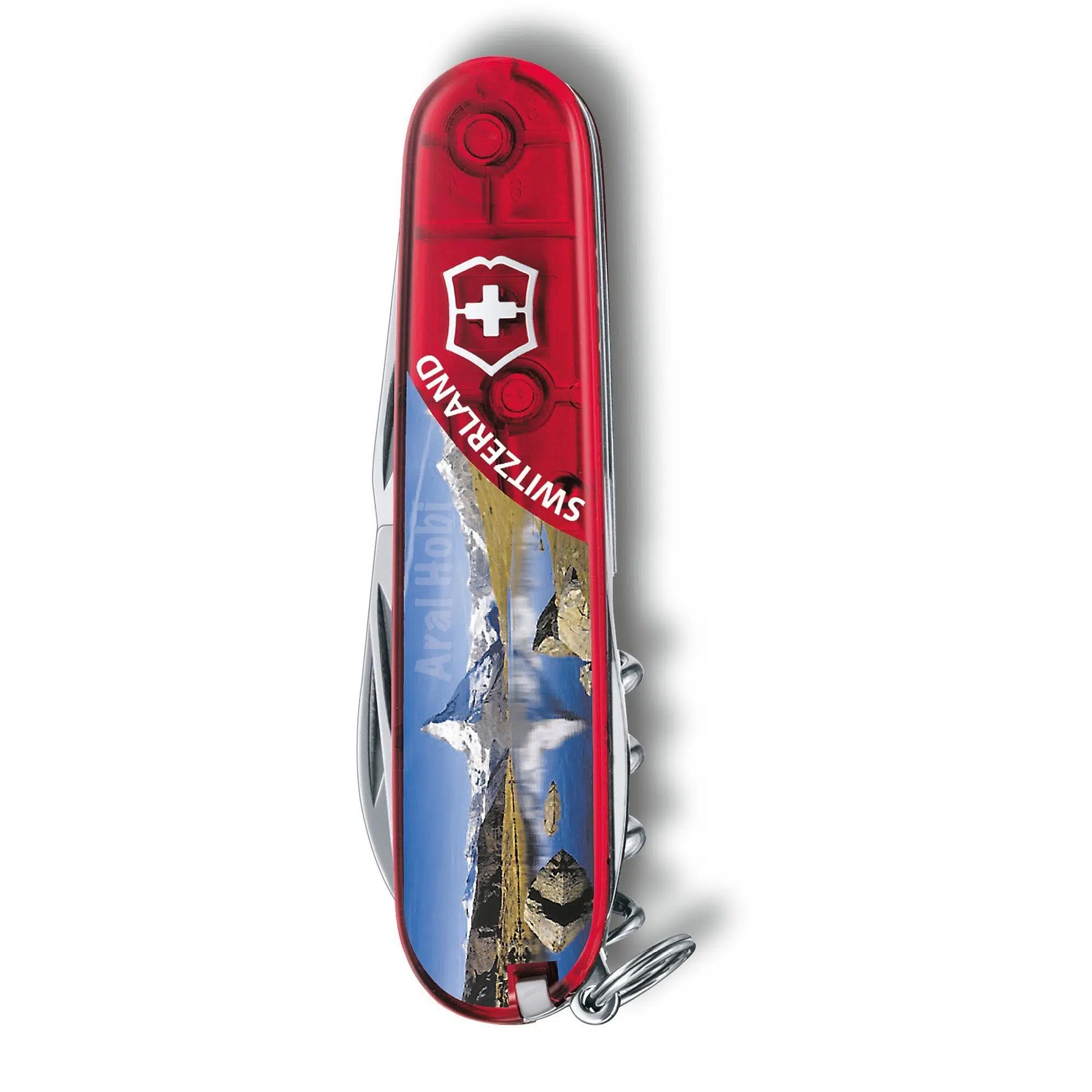 Şeffaf Kırmızı Alp Dağı Desenli İsviçre ÇakısıTırmanış veya yürüyüş sırasında ipleri kesmek ve ortaya çıkan sorunlarla baş edebilmek için mükemmel bir İsviçre çakısı.